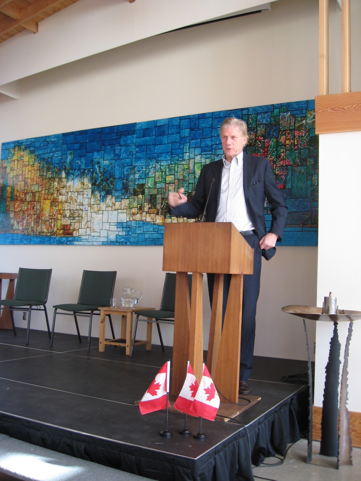 Hart Jansson introducing keynote speaker Lawrence Martin, a distinguished writer and journalist, author of many books and articles. Harperland is well known. He is not just the Wikipedia “Big L Liberal”. He has criticized both Chretien and Harper. He is “against government when it does bad deeds.”